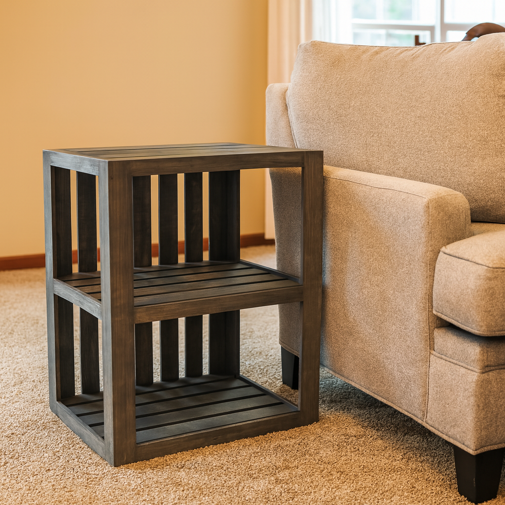 Add a touch of rustic charm to your living space with this handcrafted wooden end table, featuring a beautiful antique gray stain. With its sturdy open-slat design and versatile 2-tier structure, this table is perfect for storage, organization, and display in any room.